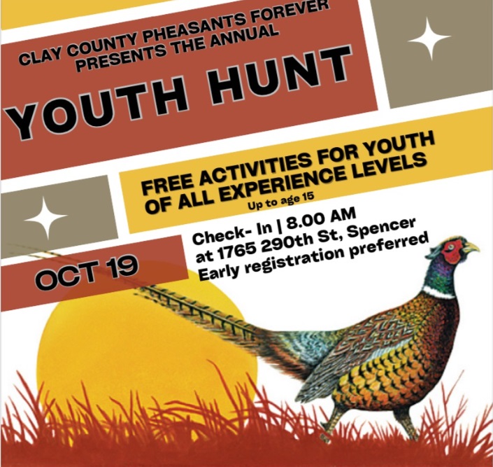 (Spencer)– Clay County Pheasants Forever will be holding a youth hunt this Saturday. Club spokesman Paul Daniels says it will take place at the Prairie Flower near Fostoria beginning at 8:00 am with registration… Daniels says it’s free to area youth up to 15 years of age… Daniels says they’ll be serving pizza and will […]