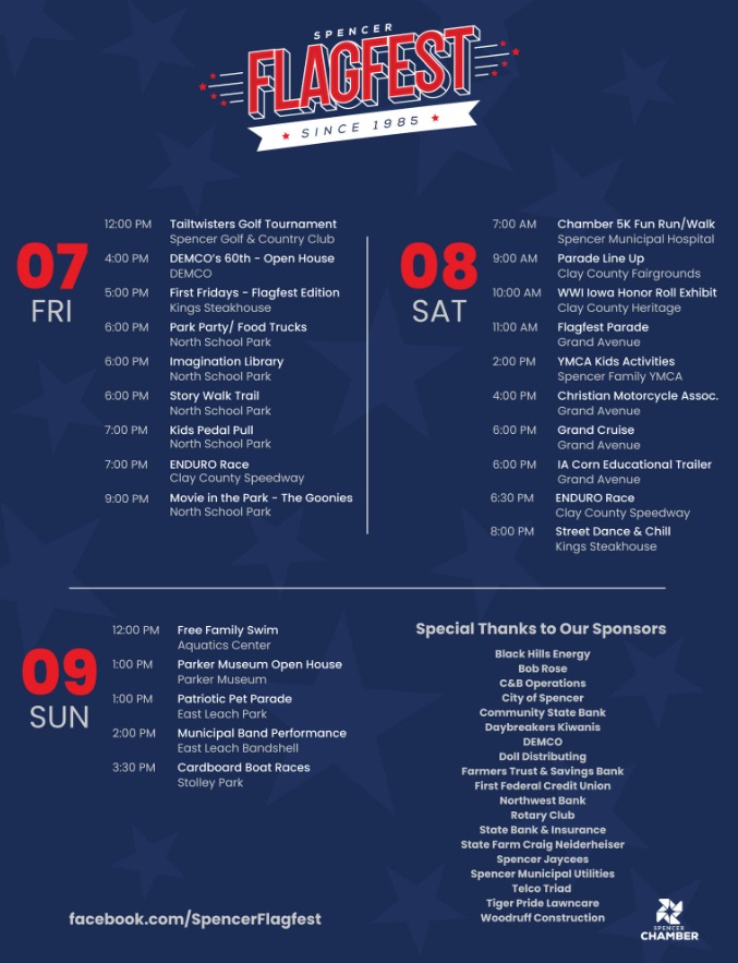 (Spencer)– Flagfest is this weekend in Spencer. Blake Goss, Events and Program Coordinator for the Spencer Chamber of Commerce, says things get underway Friday with the Tail Twister’s Golf Tournament; an open house at DEMCO Manufacturing; a First Friday event along with a number of events Friday evening at School Park… Saturday’s highlights include a […]