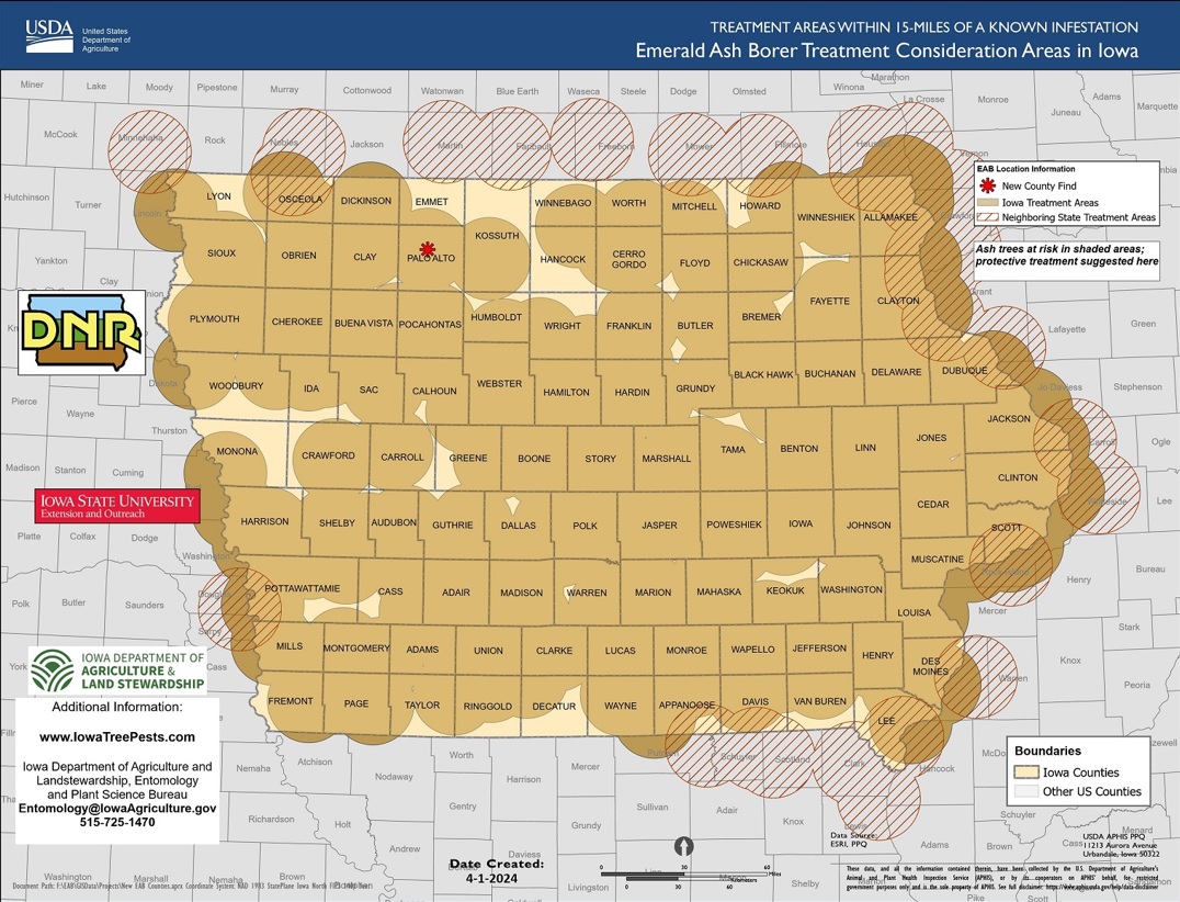 (Emmetsburg)– Emerald ash borer has now been discovered in Palo Alto county, making Emmet county the only county in Iowa where the pest has not been officially confirmed yet. The U.S. Department of Agriculture Animal and Plant Health Inspection Services says the pest was found in samples collected in March from an ash tree in […]