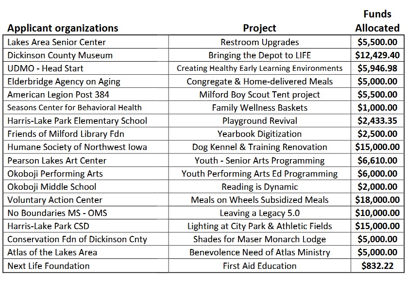 (Spirit Lake)– The Dickinson County Endowment Fund has announced it’s 2023 grant recipients. 18 different nonprofit groups from throughout the county were awarded a total of $123,752: In 18 years of grant making, the Dickinson County Endowment Fund, made possible largely through the county’s share of gaming revenue, has provided a little more than $1.74 […]