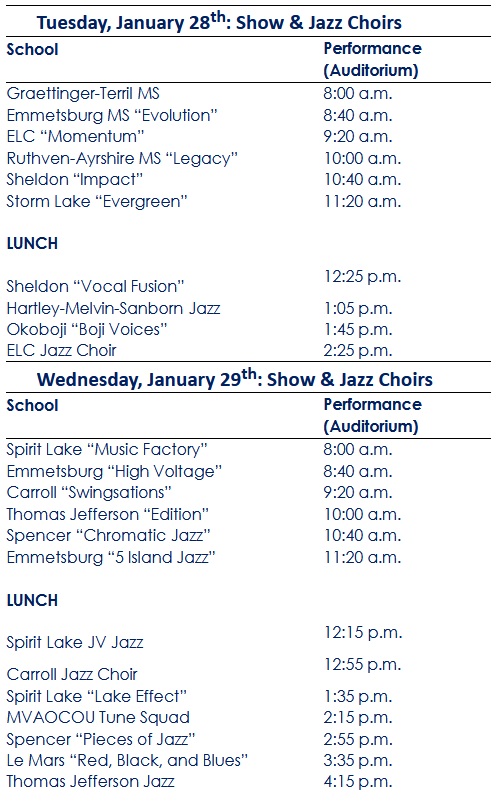 (Estherville)– The 2025 Jazz Choir and Show Choir Festival is coming up January 28th-30th at the Janice K. Lund Performing Arts Center at the Estherville Campus of Iowa Lakes Community College. Brett Fuelberth, Vocal Music Professor, says a number of schools from throughout the region will be participating…
